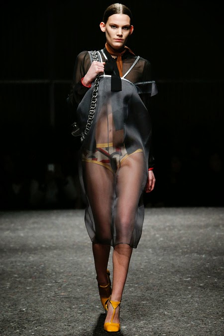 Miuccia and Fassbinder, who died in 1982, were more or less of the same generation and were shaped by the same social and political forces, so it was easy to see the appeal of the director for the designer. "His humanity, his love of culture, his love of telling a story," she enthused. "I had so much fun watching all those movies. They gave me a relationship with something less fancy, more dark." That clarified her new collection's obsession with shearling. "The opposite of rich," Miuccia called it, even though, given the volumes and extravagant shades she used, it was anything but poor. She laid it over sheer dresses, the tough and the delicate together, a longtime Prada obsession.